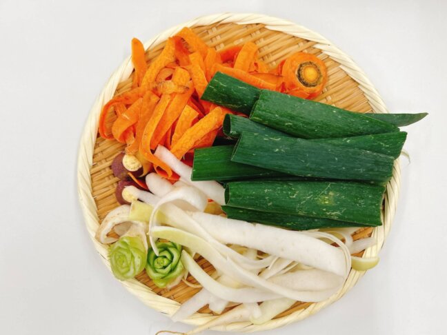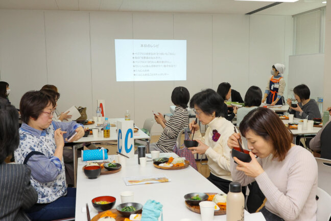 有機栽培について学んだ後は、食育リーダー特性の有機野菜を使ったランチプレートを堪能!べジブロス炊き込み「さつまいもごはん」や、べジブロス「冬野菜のおみそ汁」など、有機野菜ならではのレシピです♪べジブロスとは、「皮・葉・根・種・茎の先」など、普通は捨ててしまう部分を煮出して作る「野菜だし」のこと。野菜のいのちをまるごと味わえ、有機野菜ができるまでの苦労話を聞いた後に食べる味は格別でした。