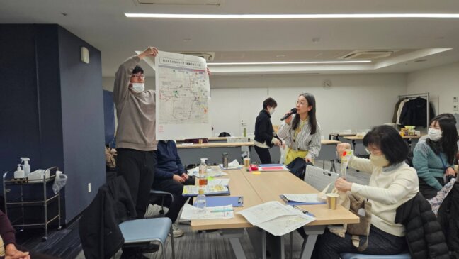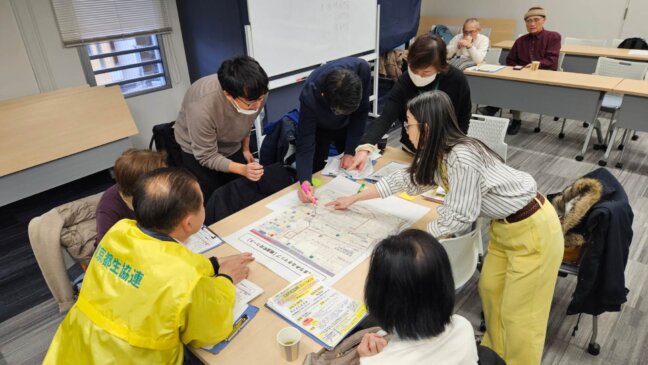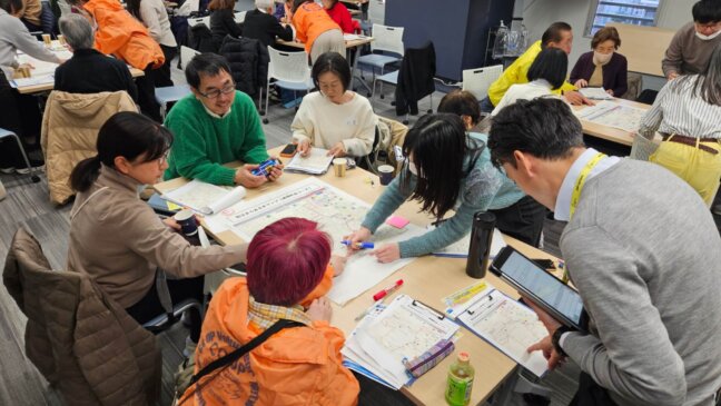 防災まち歩きの後、チームに分かれ振り返りを行いました。大きな地図にどこがポイントなのか、目印となる場所などを書き込み、共有を行いました。自分たちが歩いてきた場所に何があったかなど再確認することができました。