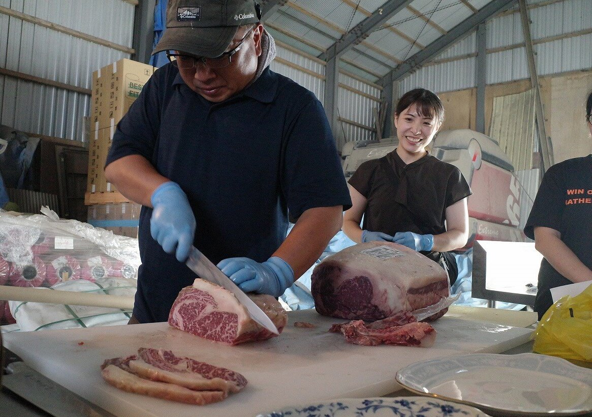 パル・ミート職員が、素早い手つきでお肉をカットし部位の説明もしてくれました。