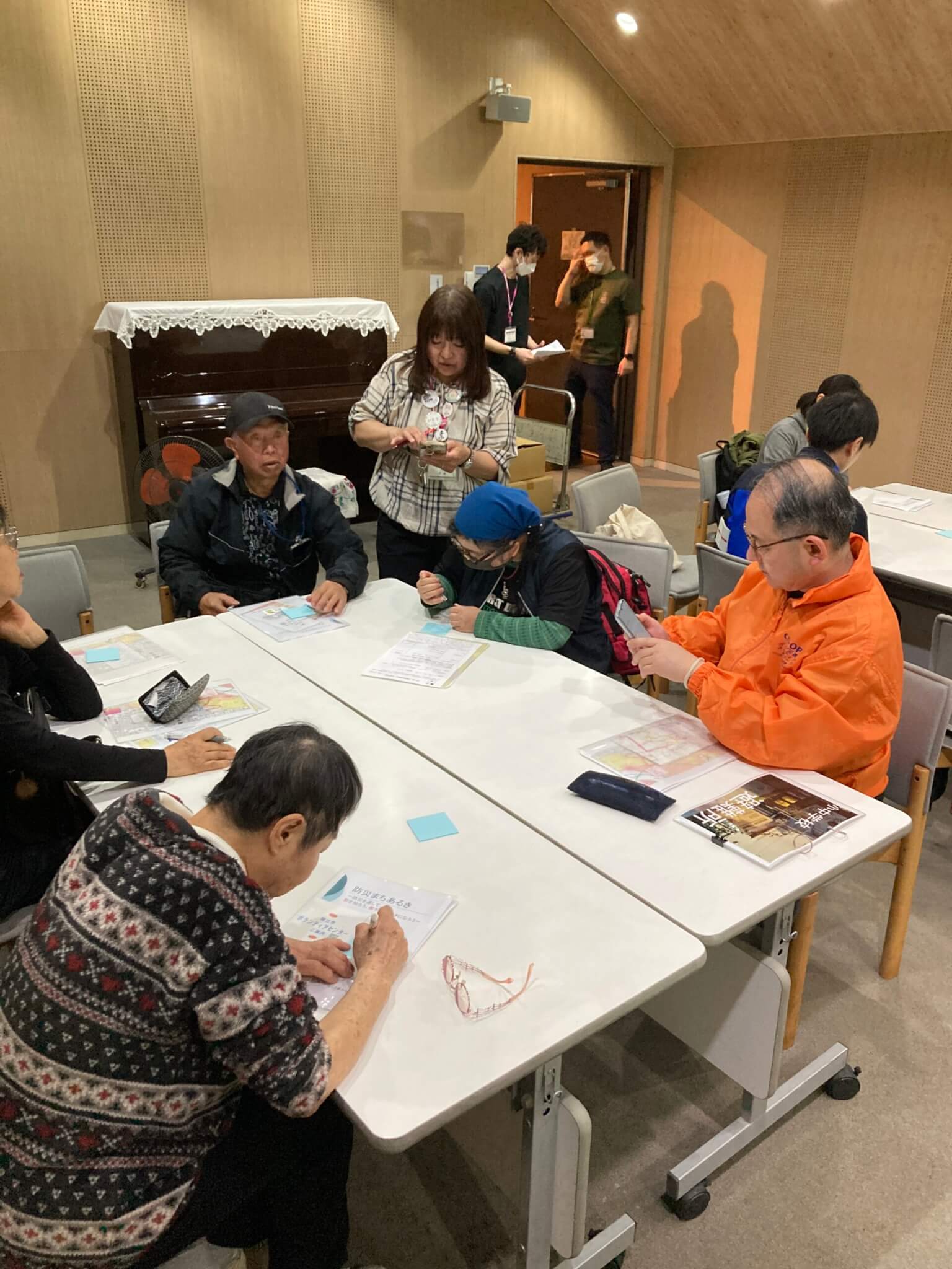 防災まち歩きの後、チームに分かれ振り返りを行いました。大きな地図にどこがポイントなのか、目印となる場所などを書き込み、共有を行いました。他の方の意見を聞き、みんなで共有をすることで、より災害が発生した際に協力し合えると感じました。地震だけでなく、台風での水害も考えなくてはいけないと改めて感じることができました。