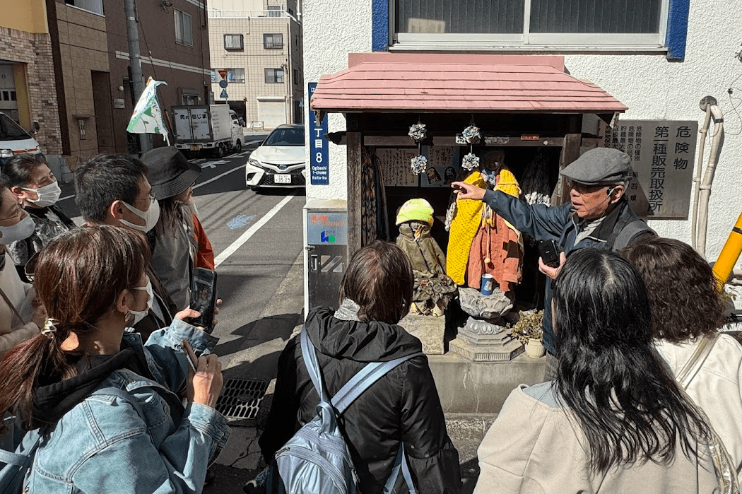 住吉駅からスタートし、まずは重願寺の「みまもり観音」を参拝しました。この観音像は空襲犠牲者を供養するために建てられたもので、当時、身寄りのない遺骨が多く納められたという悲しい歴史について、工藤副館長から解説を受けました。