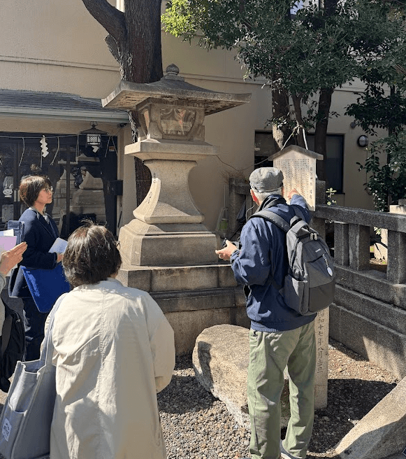 境内に残る石灯籠を見学しました。当時の熱風によって表面が剥離・変色しており、火災の凄まじさを視覚的に捉える貴重な資料となりました。