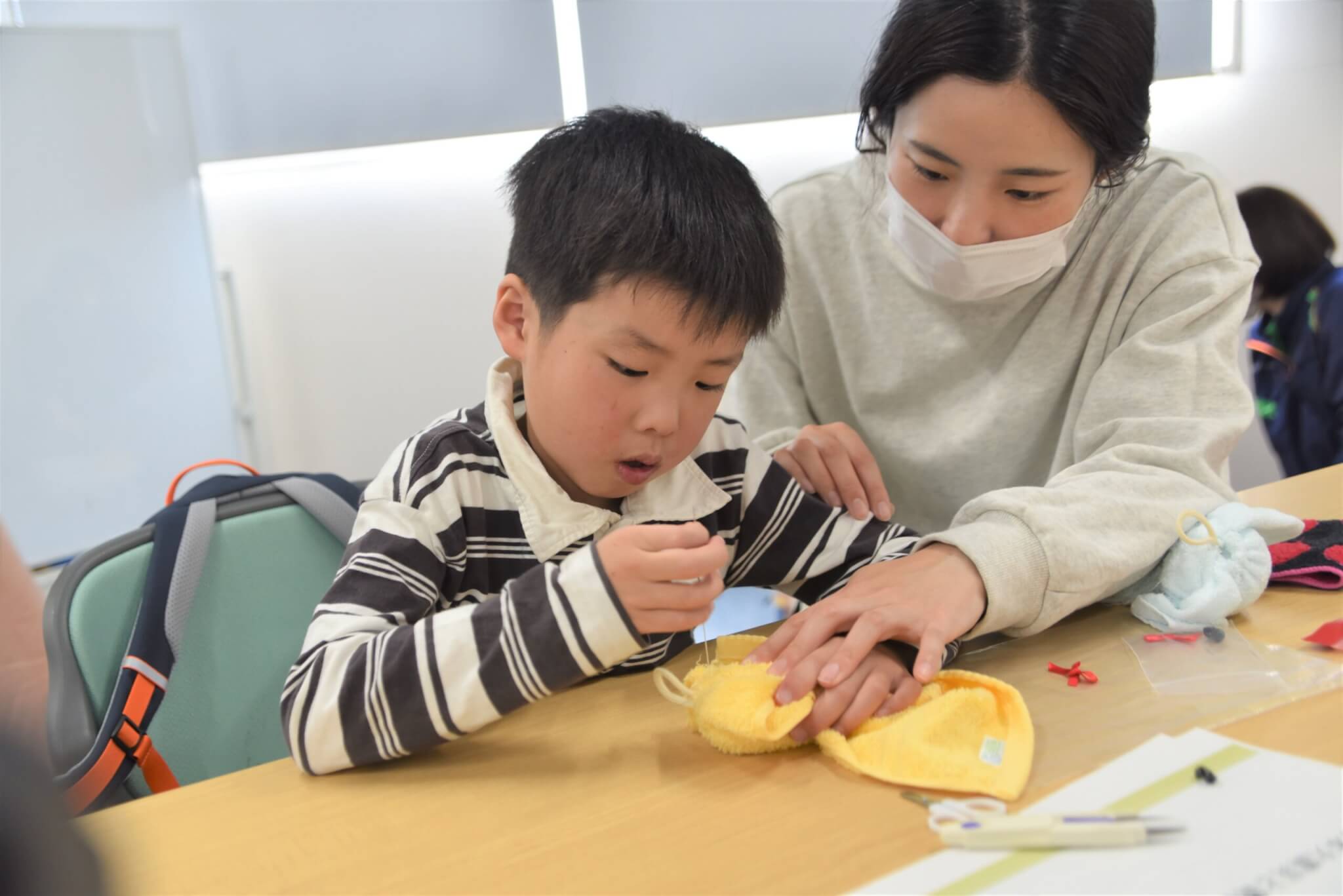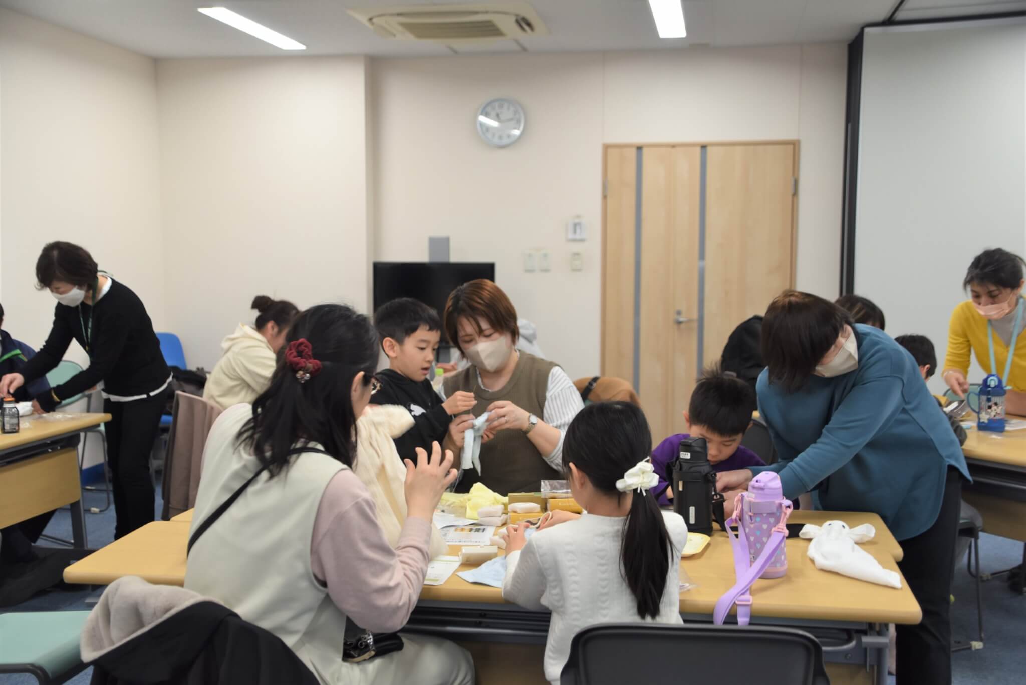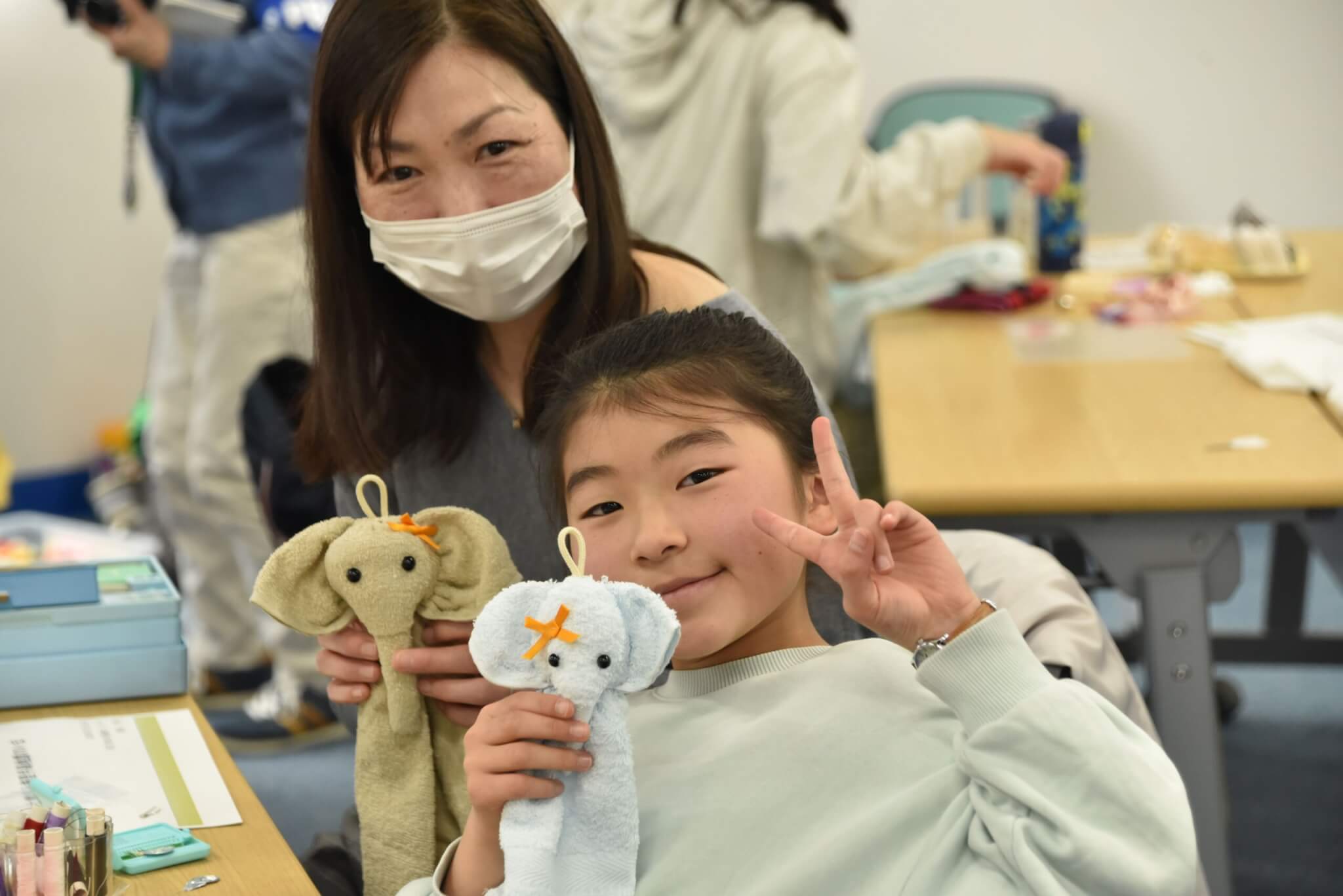 プログラムの最後は、復興支援の象徴である「まけないぞう」の作りを親子で体験しました。この活動は阪神・淡路大震災の被災者の「生きがい・仕事づくり」として始まり、現在も東日本大震災の被災者支援などに繋がっているプロジェクトです。参加者は手を動かしながら、支援のあり方について学びました。