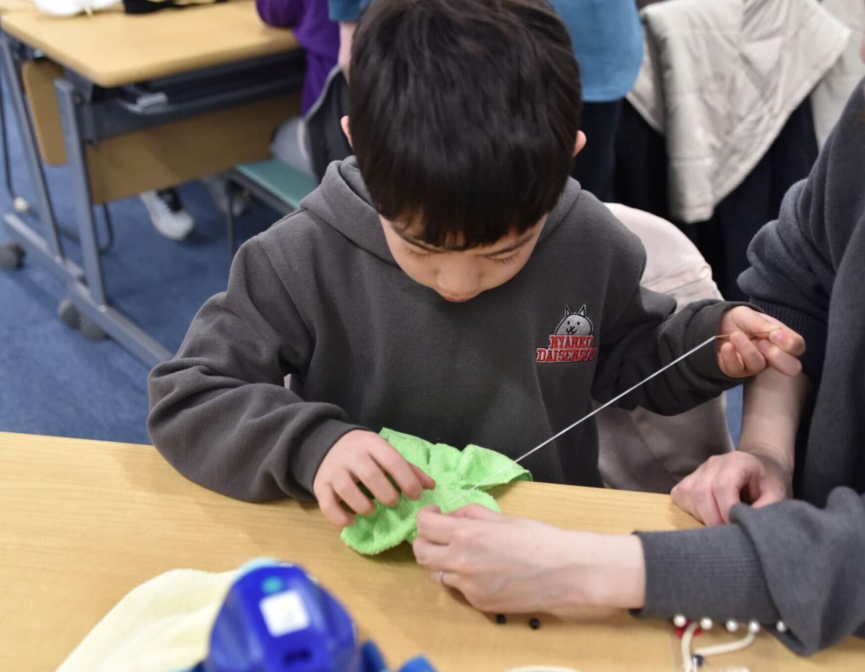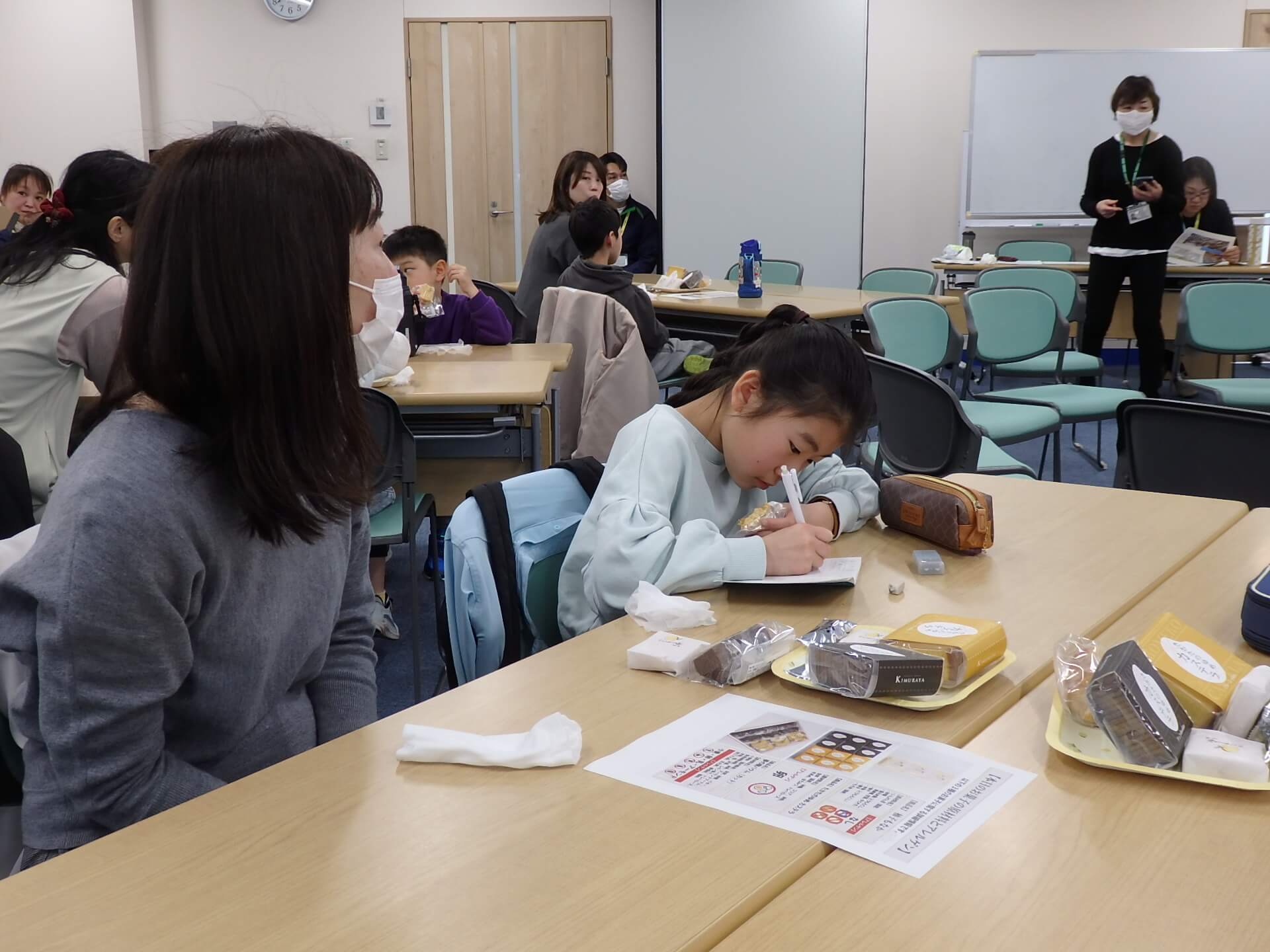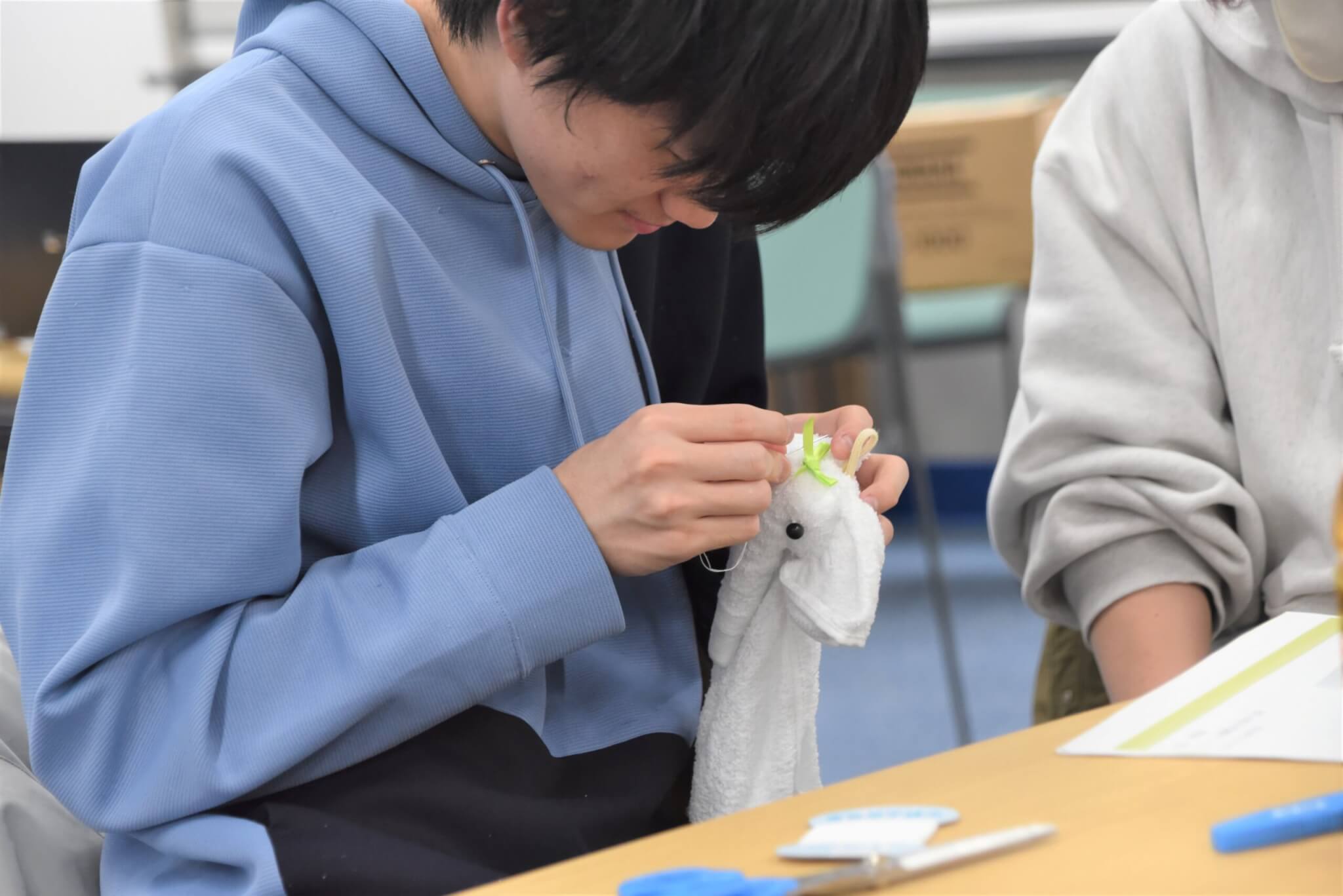 プログラムの最後は、復興支援の象徴である「まけないぞう」の作りを親子で体験しました。この活動は阪神・淡路大震災の被災者の「生きがい・仕事づくり」として始まり、現在も東日本大震災の被災者支援などに繋がっているプロジェクトです。参加者は手を動かしながら、支援のあり方について学びました。