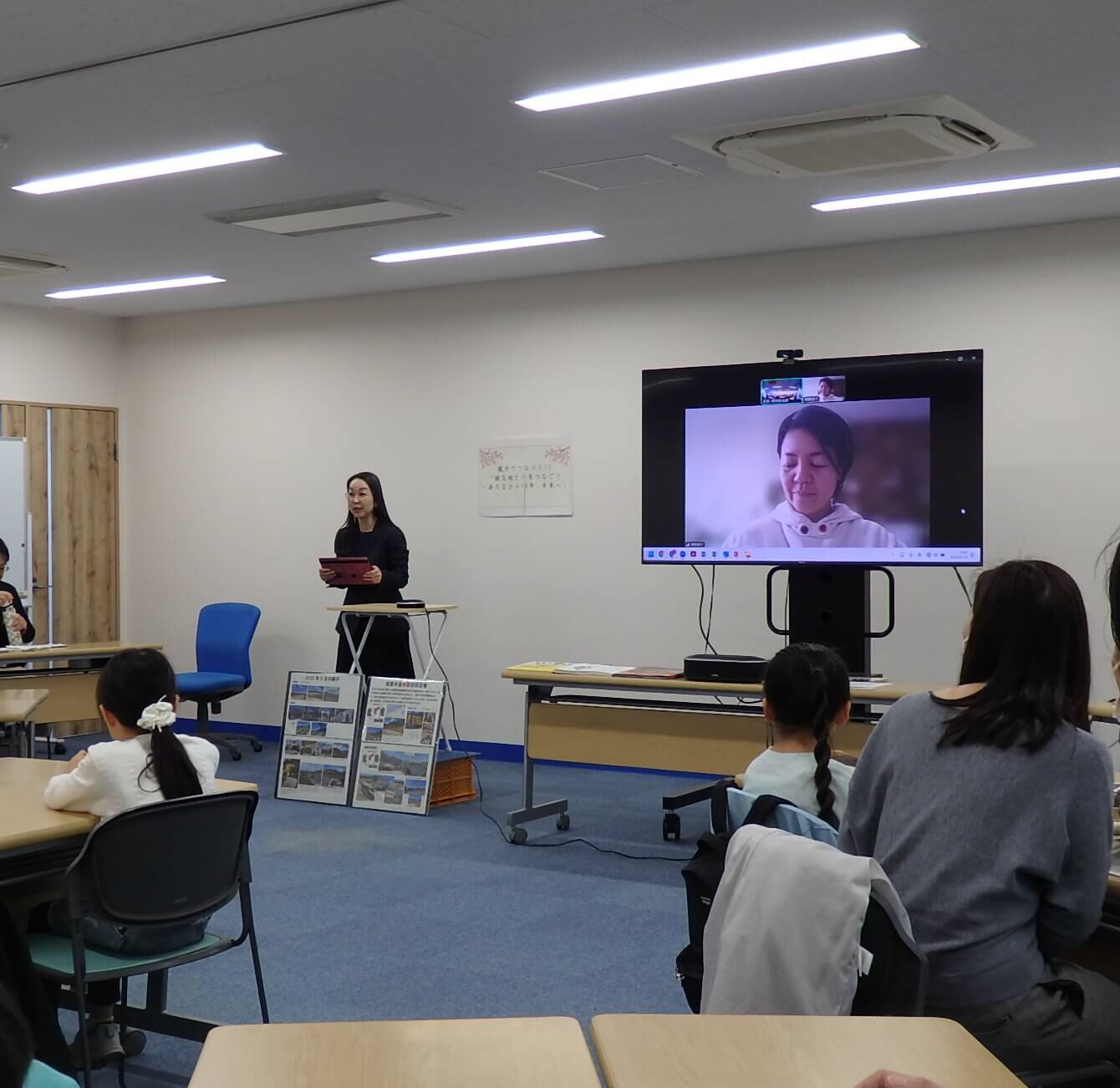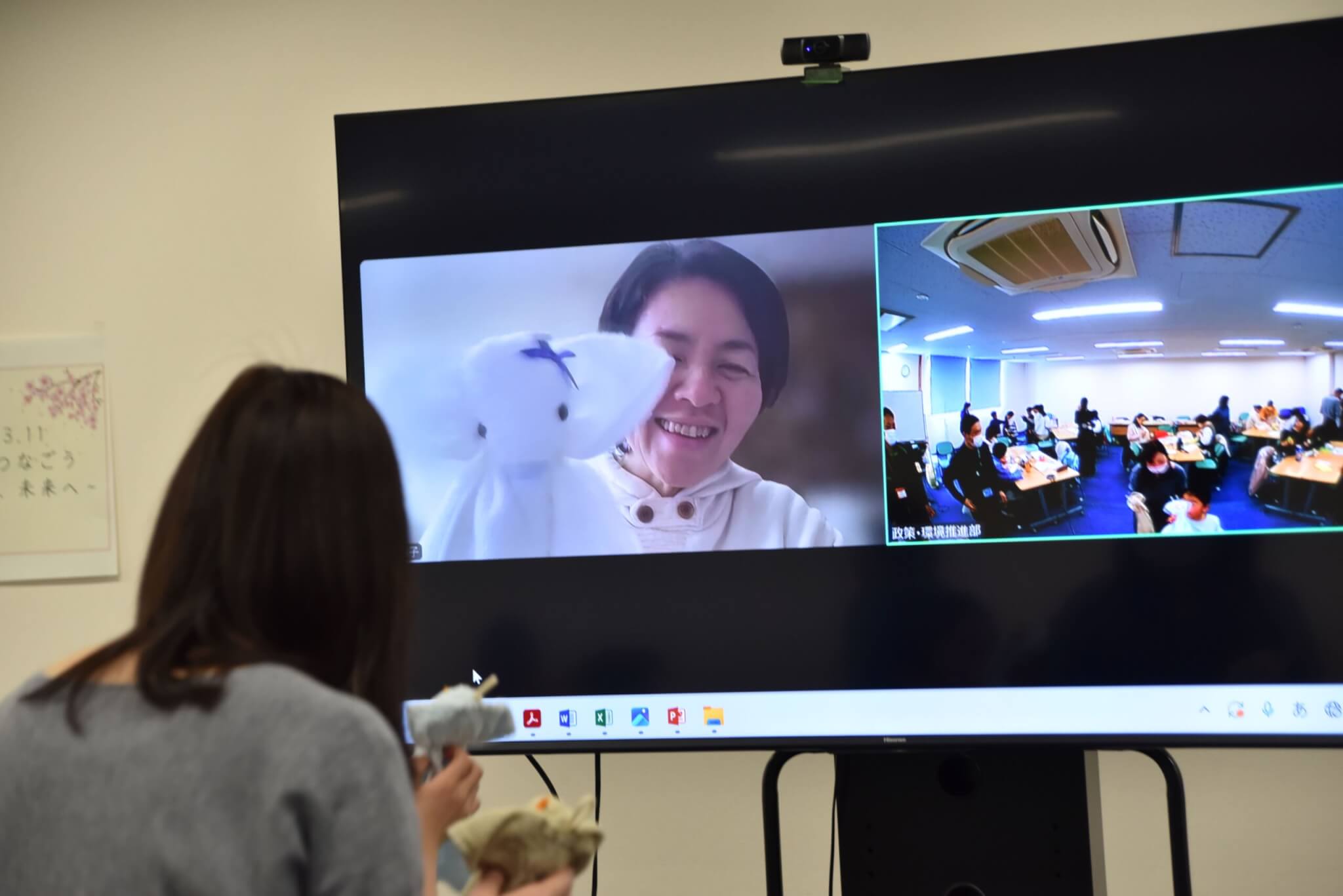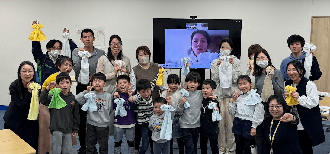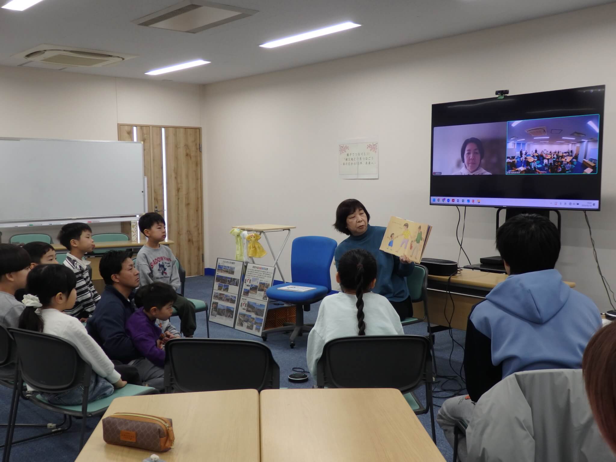 司会より、開催前に東日本大震災、そして能登半島地震で犠牲になられた方々に哀悼の意を表し、黙とうを捧げました。最初に、ぱる★キッズ足立の職員による絵本『きぼうのかんづめ』『てをつなぐ』の読み聞かせを行いました。次に、被災地NGO恊働センターの増島智子(ますじまともこ)氏に能登からオンラインでご登壇いただき、基調講演を行いました。その後、「まけないぞう」のワークショップを親子で体験しました。
