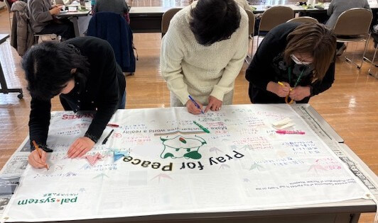 3月、4月エリア協議会(全9エリア)、第3回総代会議では、組合員の皆さんからピースフラッグにメッセージを寄せ書きしていただきました。