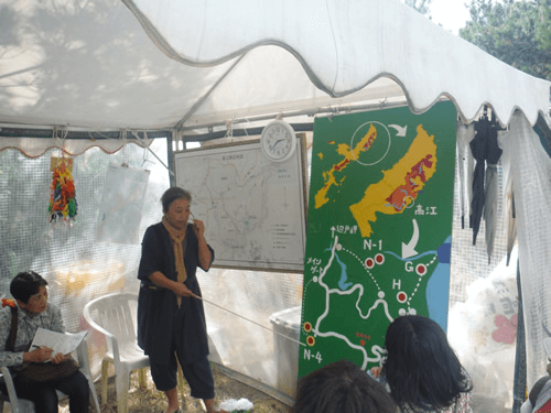 ツアーガイドの瀬戸隆博氏(恩納村史編さん係、嘱託員)にご説明いただきながら、嘉数高台(展望台から普天間基地を見学)、辺野古基地建設予定地・座り込みテント、瀬嵩の浜、安保の見える丘(嘉手納基地)を見学しました。特に、辺野古座り込みテントでは、活動されている山本氏のお話を参加者全員真剣に聞き入っていました。山本氏からは、辺野古基地建設の状況説明とともに、「自分の住んでいる地域に米軍基地が出来たら誰だって嫌なはず。沖縄だけでなく自分たちの問題として考えてほしい」といったお話がありました。