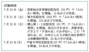 支援活動は、傾聴活動を主とした「ふれあい喫茶」の運営で、登米市・南三陸町の4つの仮設住宅を中心に開催。お茶菓子を提供し、ボランティアによる傾聴活動や、避難者同士、避難者と地元住民との交流など、地域のコミュニティづくりに貢献、避難者の孤立化防止の一部を担いました。