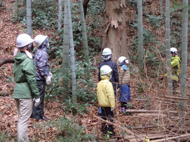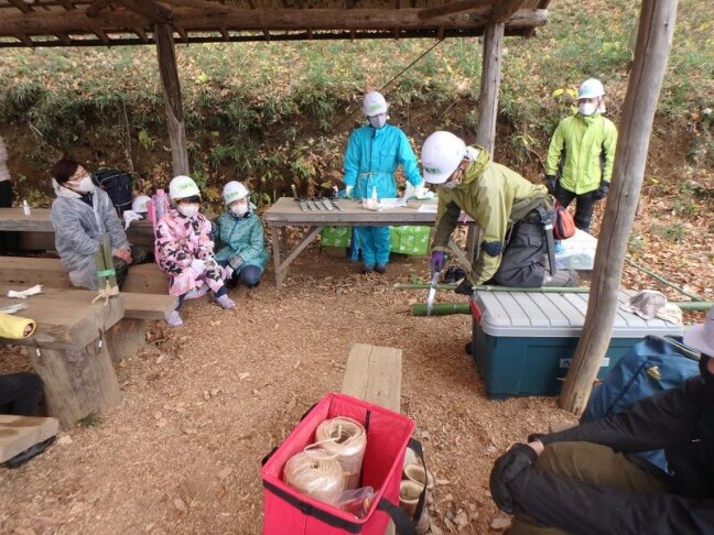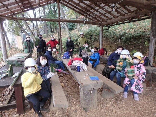 肌寒い天候でしたが、冬の里山で竹林保全の意義や自然の材料に触れ、都会の生活では味わえない体験企画となりました。子どもたちも試行錯誤しながら、時間内に全員がミニ門松本体を作り上げました。時短のため飾り付けの時間が少なくなってしまいましたが、お正月までまだ時間があるので、続きはご自宅で完成させていただければと思います。