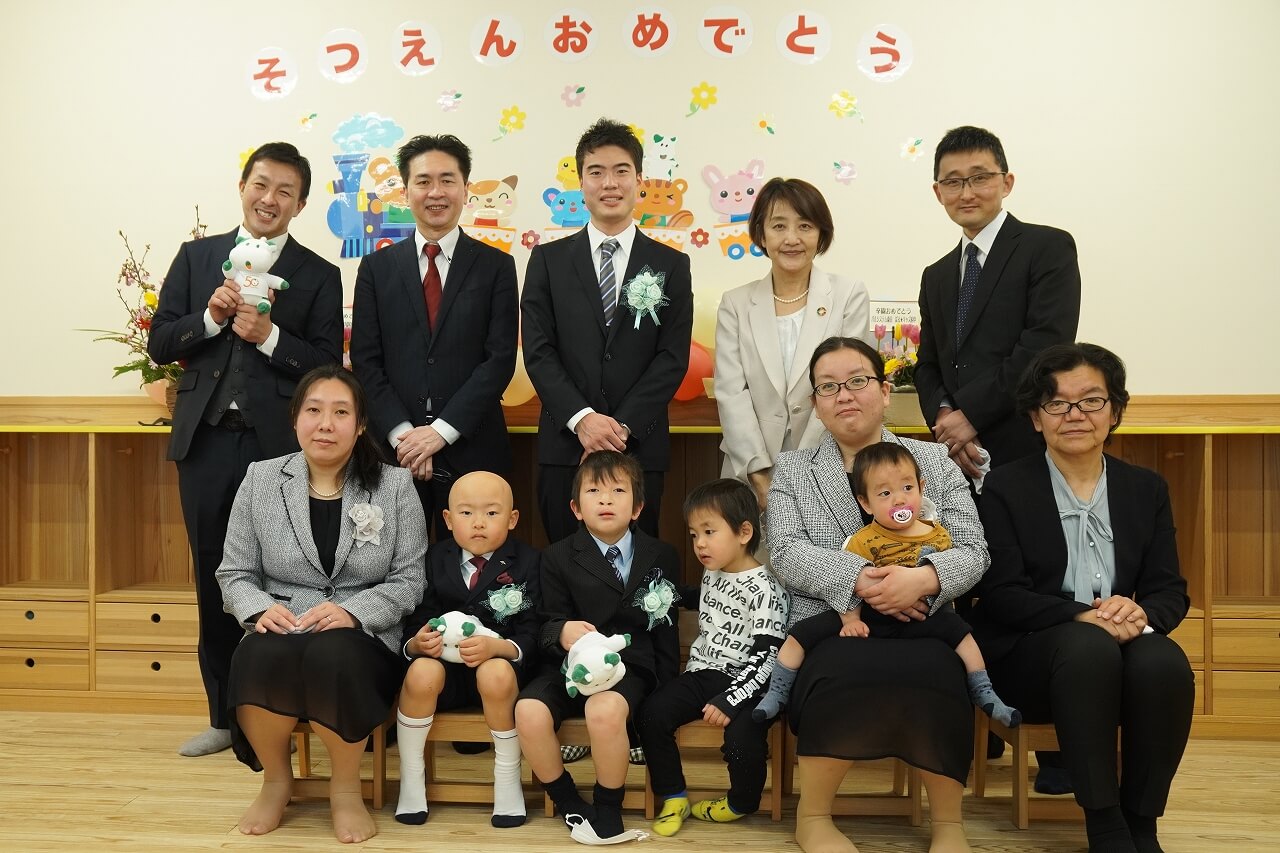松野理事長(写真後列右から2番目)もお祝いに駆けつけて、ささやかながらも心に残るステキな卒園式となりました。