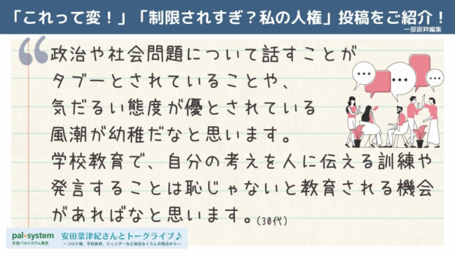 開催前には、参加者から寄せられた「これって変!」の声を紹介。「説明がつかないルールが学校という狭い社会でまかり通っていることが、互いを監視し合う空気を作り出していることにつながっていると思います」などのコメントが流れ、トークイベントでも取り上げられた。