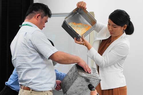 「目をつぶり、これが核兵器だったら何が起こるかを想像しながら13,880発を体感してみてください」と前置きして中村さんは13,880発のBB弾を落としました 音を聞いた参加者は「長かった...」「これがある中では暮らせないと思った」 と真剣な面持ちで感想を述べました