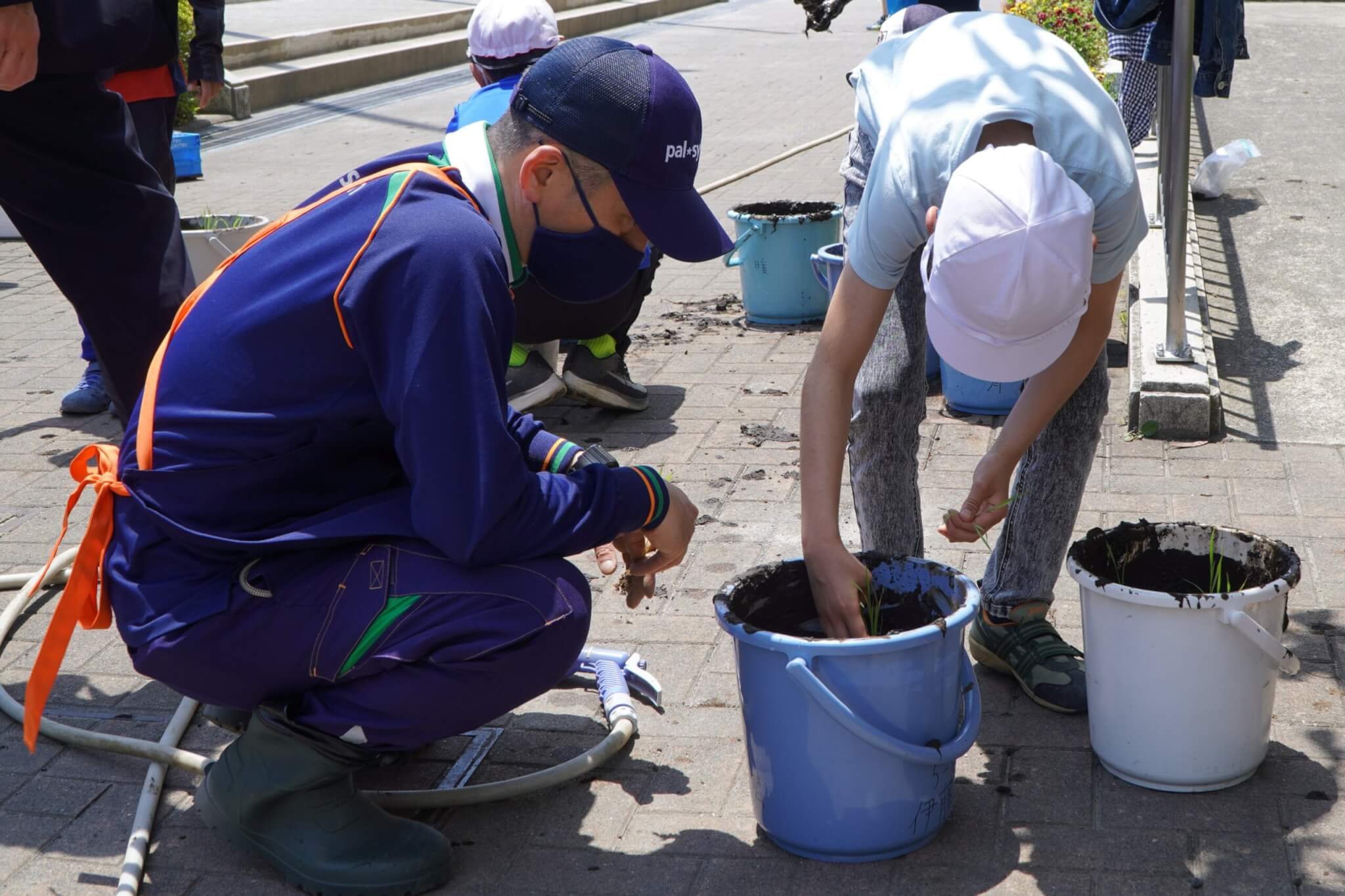 5月19日(木)は晴天の中、多摩市立愛宕小学校5年生のみなさんと、バケツに稲の苗植えを行いました。