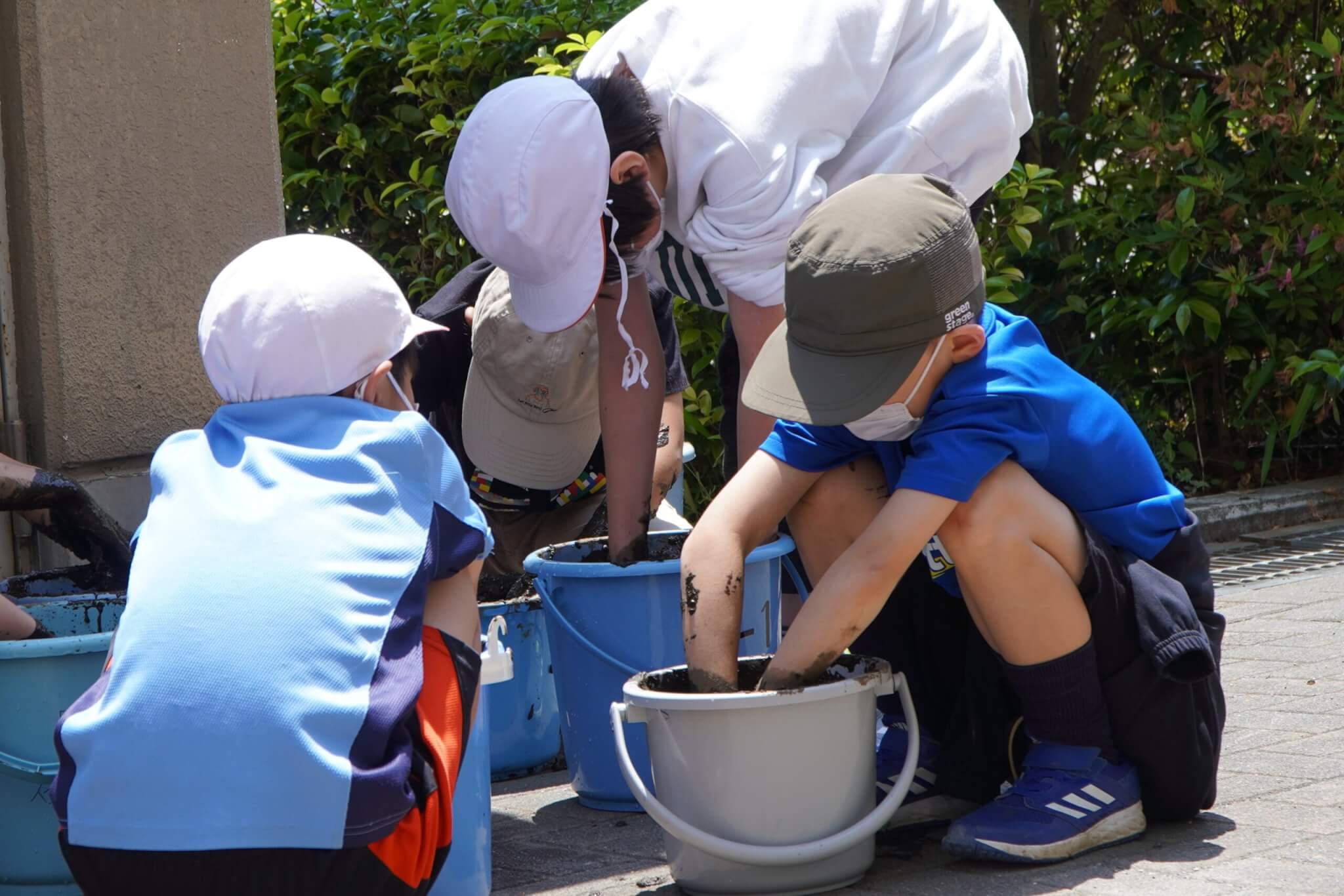 手がどろどろになり楽しそうな児童、ちょっとためらう児童、それぞれ自分のバケツをかき混ぜています。