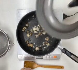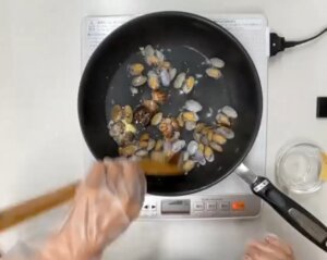 ②にんにくの香りがしてきたら、江戸前あさりとお酒を入れ、蓋をする