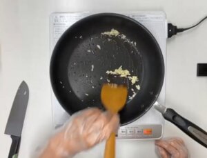 ①みじんぎりにしたにんにくをオリーブオイルで炒めます