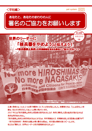 パルシステム東京では「核兵器禁止条約」の早期締結を求める署名を呼びかけ、12月17日までに26,782筆が寄せられました。