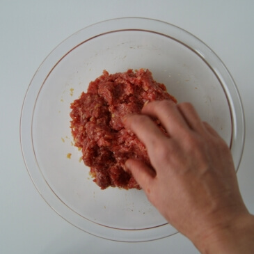 肉に塩を加えるとたんぱく質が網目状となり、肉の水分が網目の中に閉じ込められてジューシーに。ただし、手の温度で網目構造がこわれると肉汁が流れ出てしまうため、こねすぎない。肉の食感も残る