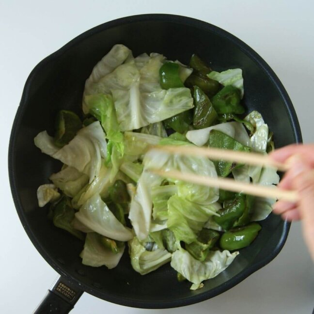 ピーマン、キャベツをフライパンに戻して全体を手早く混ぜ、しょうゆをまわしかけてさっと炒め、火を止める。好みで花椒をかける。
