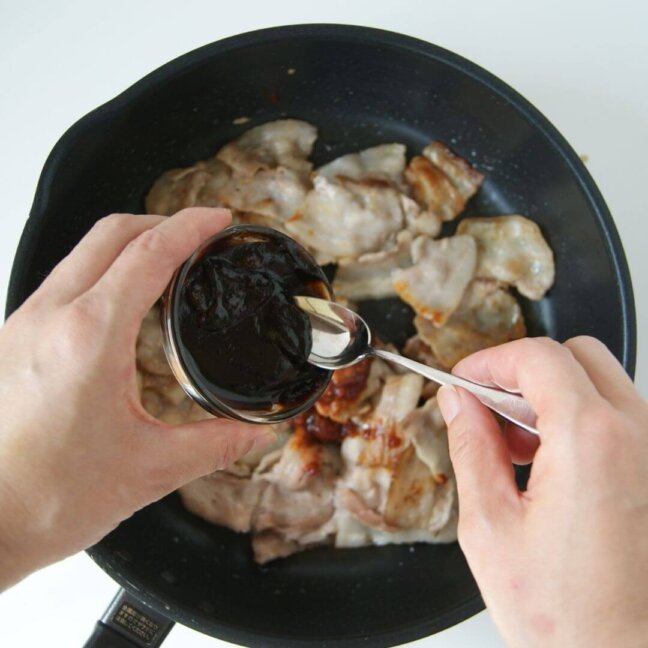 甜麺醤、豆板醤、好みで花椒(ホワジャオ)(分量外、適量)を加え、肉にしっかりからめて、中火で炒める(コツ➌)。
