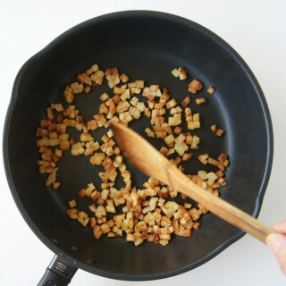 じゃがいもは水にさらさず(コツ❶)、油をひいた深めのフライパンに入れる 。中~強火で焼き色がつくまで炒め、皿に取り出す。