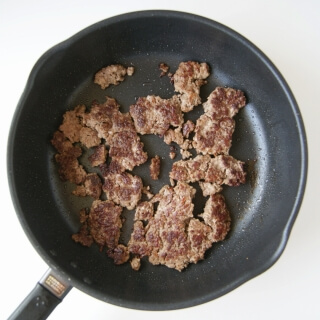 (2)のフライパンに肉を入れて平らにならし、塩・こしょうで下味をつける。強火にかけ、肉を動かさずに焼き色をつける(コツ❷)。かたまりのまま裏返し、裏面も同様に焼き色をつけ、ほぐす。