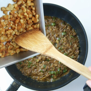 じゃがいもは炒めすぎると崩れて食感が損なわれるため、一度取り出して最後に加える。食感も風味も残り、味の幅が広がる