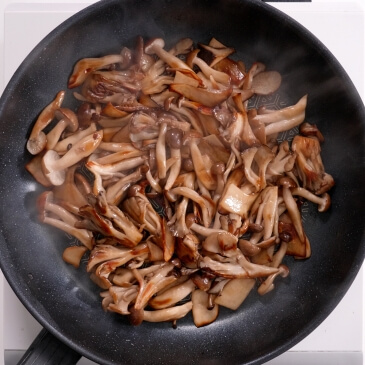 ふたたび強火にして、パチパチと音がしたたら上下を返し、きのこの両面に焼き色をつける(コツ❷)。