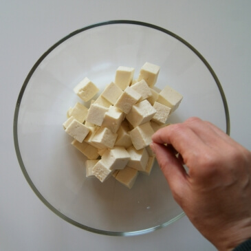 豆腐を食べやすい大きさに切り、塩をかけてから600Wのレンジで2分加熱し、水けをきる(コツ❶)。