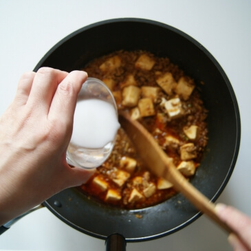 調理は、炸醤を作る→スープ状にする→豆腐を加えるというように、工程ごとに覚えるとよい。炸醤は担々麺の具などに応用できる