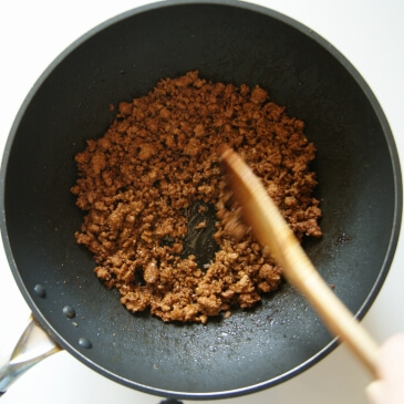 中火にして甜麺醤を加え、肉に色がつくまで炒める。
