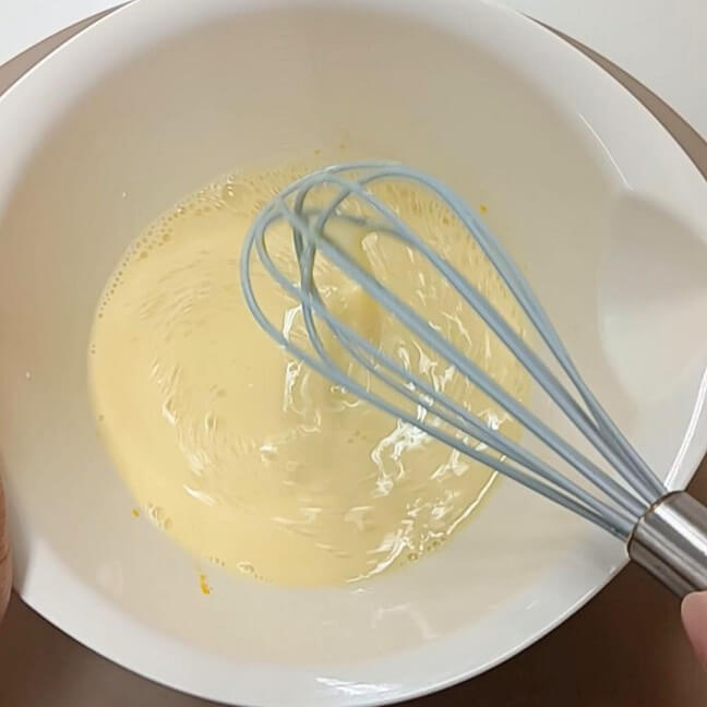ボウルに、卵、砂糖を入れてよく混ぜ、牛乳を加えてさらに混ぜる。