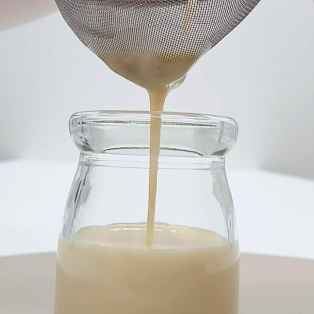 (1)の卵液を茶こしでこしながら耐熱容器に入れる。