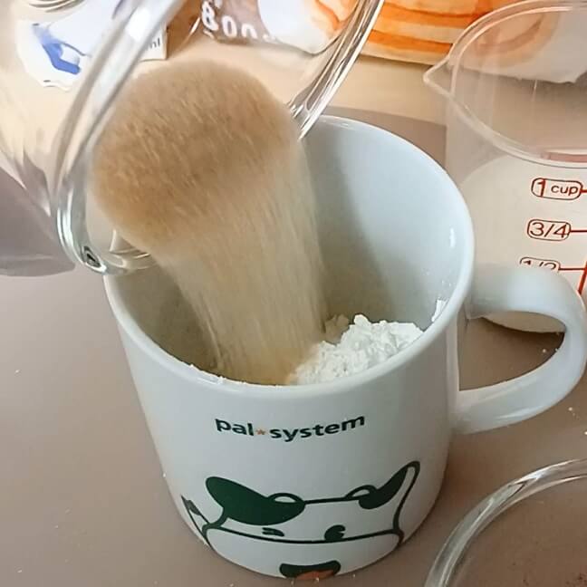 ホットケーキミックス・純ココア・砂糖をマグカップの中で混ぜる。