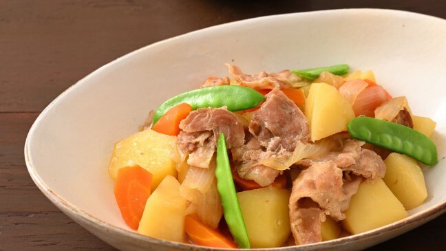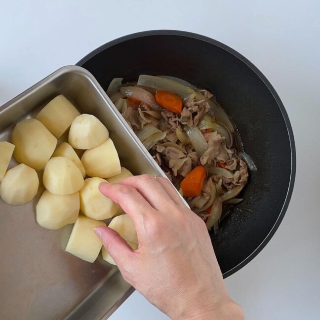 煮くずれしやすいじゃがいもはあとから入れ、あまり動かさず、余熱も利用して火を通す