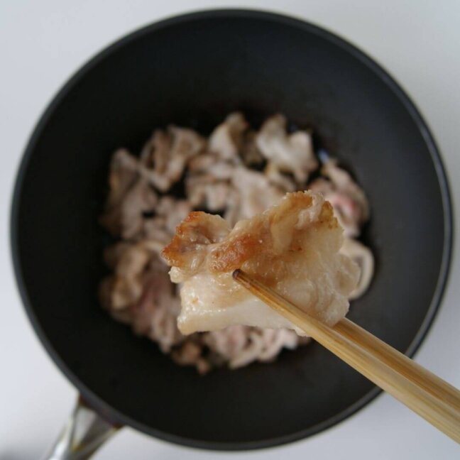 片面に焼き色がついたら、ペーパータオルで肉の脂を9割ほどふきとる。