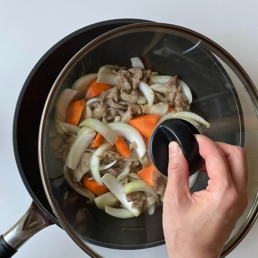 ふたをして中火にかける。焦げつきそうになったら少量の水(分量外)を加え、蒸し焼きで10分ほど加熱する(コツ❷)。