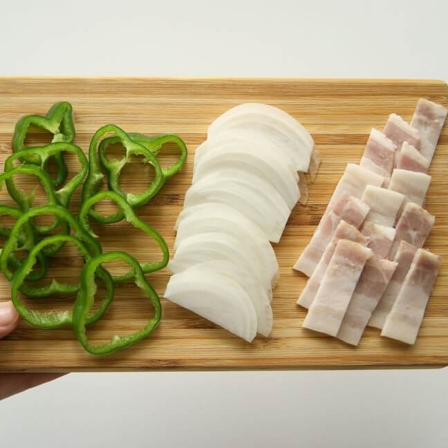 ★具材は、ベーコンや、2~3mm幅に切った玉ねぎ・ピーマンなど
