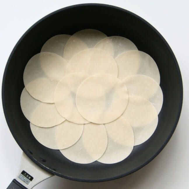 直径24cmほどのフライパンに、餃子の皮を外側から内側に重ねて並べる(コツ❷)。