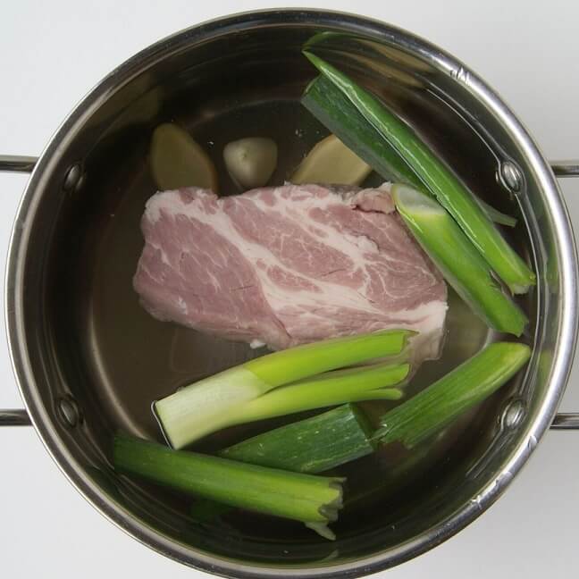 鍋に肉、にんにく、しょうが、長ねぎ(手でちぎる)、肉がかぶるくらいの水(分量外)を入れる。